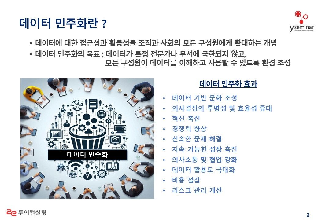 데이터 민주화는 데이터에 대한 접근성과 활용성을 조직과 사회의 모든 구성원에게 확대하는 개념입니다. 데이터 민주화의 목표는 데이터가 특정 전문가나 부서에 국한되지 않고 모든 구성원이 데이터를 이해하고 사용할 수 있도록 환경을 조성하는 것입니다.