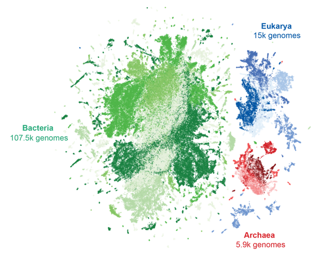 - 학습 데이터: EVO-2는 모든 생명체의 영역(진핵생물, 원핵생물, 고세균)에서 수집된 8조 8천억 개의 토큰(뉴클레오타이드)으로 구성된 대규모 데이터 세트인 OpenGenome2를 사용하여 자기 회귀 방식으로 사전 학습되었다. 이 광범위한 데이터 세트는 이전 모델인 EVO-1이 주로 원핵생물 게놈에 초점을 맞춘 것과 비교하여 전례 없는 종 간 일반화 능력을 제공하며 적용 범위를 크게 확장한다. EVO-2는 약 13만 종의 게놈에서 추출한 9조 3천억 개 이상의 DNA 염기 서열로 학습되었다. OpenGenome2 데이터 세트는 허깅페이스에서 공개적으로 이용 가능하다. 단, 안전상의 이유로 바이러스 게놈은 학습 데이터에서 제외되었다.