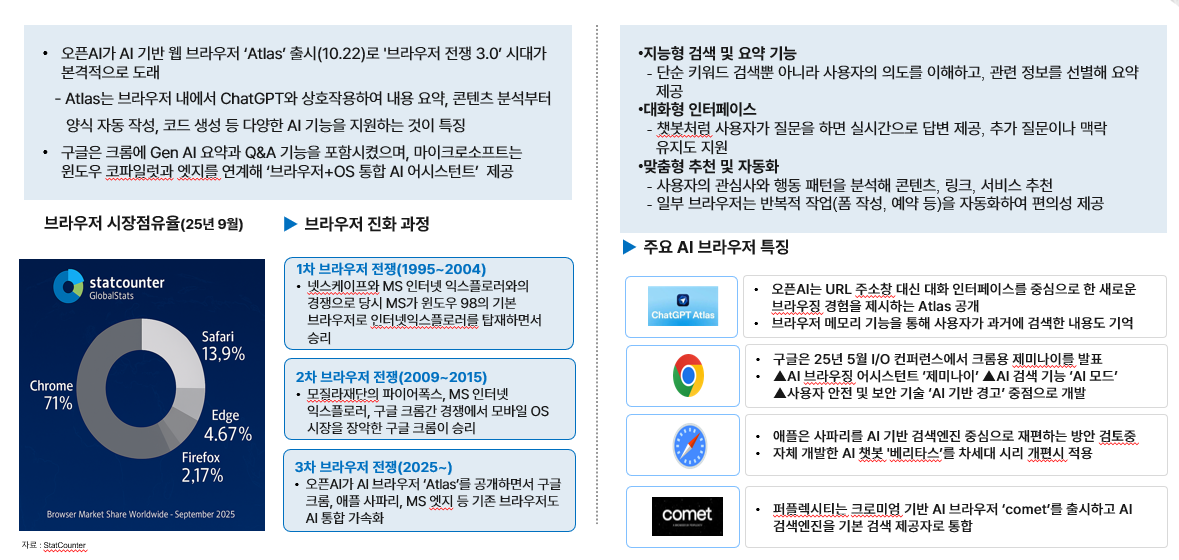 2025년 10월, 오픈AI가 AI 기반 웹 브라우저 ‘Atlas’를 출시하면서 브라우저 산업은 새로운 전환점을 맞이했다. 이로써 1990년대 인터넷 익스플로러(IE) 시대, 모바일 중심의 크롬 시대에 이어 세 번째 브라우저 전쟁(AI 브라우저 전쟁)이 본격화되고 있다.