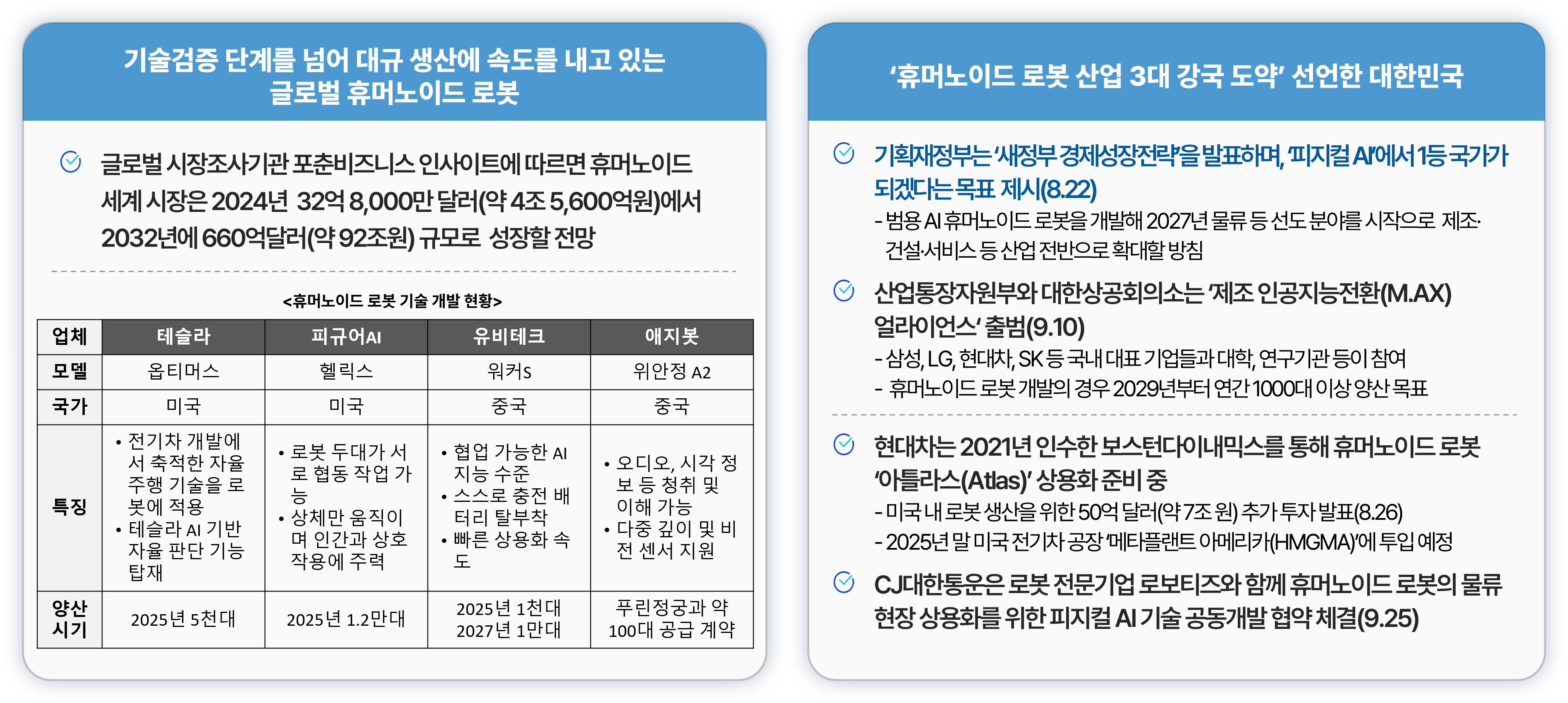 정부 차원에서도 국가 전략 재정비에 나섰습니다. 2025년 8월 기획재정부가 발표한 ‘경제성장전략’에는 휴머노이드 로봇을 미래 제조업 혁신의 핵심으로 키우겠다는 청사진이 담겼습니다. 이에 따르면 정부는 2027년부터 물류 분야에 휴머노이드 로봇을 시험 도입하고, 2029년부터는 국산 범용 휴머노이드 로봇을 연1,000대 이상 양산하여 2030년에는 세계 3대 휴머노이드 강국에 진입한다는 목표를 밝혔습니다.